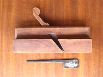 The pastry wheel (or pie crimper) and plane are American. We purchased the pastry wheel at a midwestern auction in the 1980s. It has a walnut handle, forged and lathe turned wrought iron wheel holder, and a brass wheel, and dates around 1850. The plane was made in Massachusetts around 1800 and has the typical relieved wedge of that era and region.